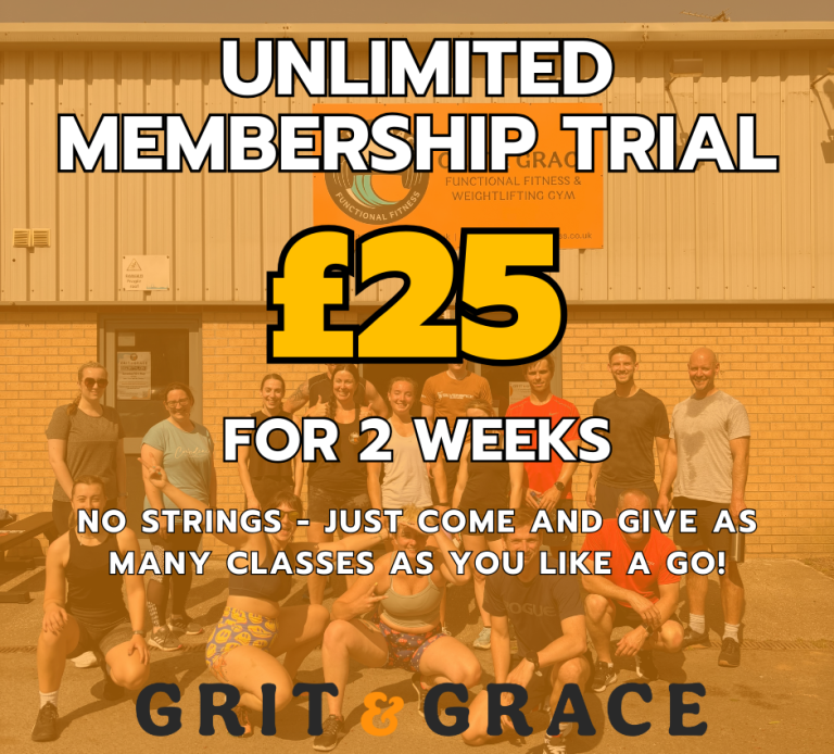 Book as many classes as you like, try out our different sessions and meet our amazing community. This is a fantastic opportunity to dive in and give it a go. There's no strings attached, we just want to welcome you in and give you a great opportunity to see if Grit & Grace Fitness is for you!